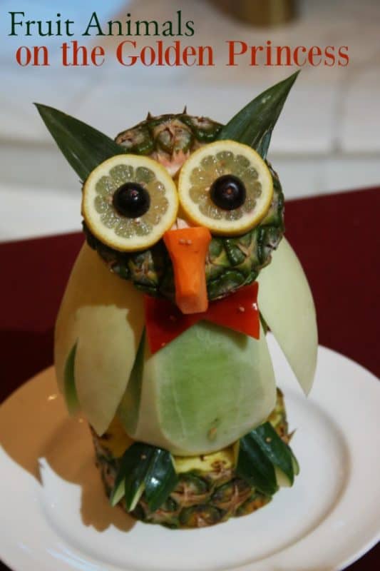 It is so worth waiting in line to see all of the amazing fruit animals. Every time we are on a Princess Cruise I am in awe of the fruit animals. Who would have thought you could turn fruit into this great owl.