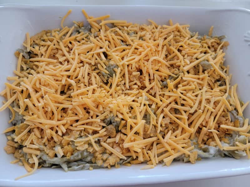 - Pour green bean mixture into a greased casserole dish. Top with cornflake crumbs evenly, sprinkle grated cheddar cheese over the top.