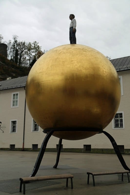We exited the Salzburg Cathedral and headed to Chapter Square also known as Kapitelplatz. There is a giant oversize chessboard that can be played during the summer. You can't miss the giant gold ball with a statue on top of it modern art that takes up a large portion of the square.